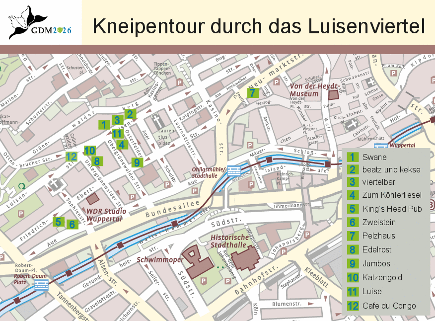 Für den gemütlichen Ausklang am Abend haben wir für die Teilnehmer*innen eine Auswahl besonders empfehlenswerter Lokalitäten zusammengestellt. Insgesamt 12 Lokale laden zu einer kleinen Entdeckungstour durch das lebendige Louisenviertel ein – ideal, um den Tag bei guten Gesprächen, leckerem Essen oder einem Getränk in entspannter Atmosphäre ausklingen zu lassen.