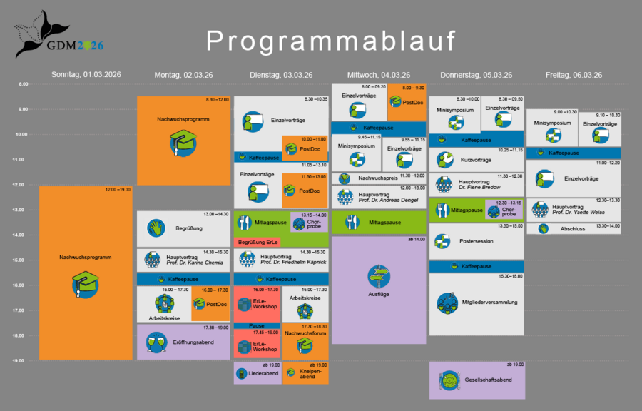 Die GDM blickt auf eine lange Tradition zurück, und entsprechend dürfen bestimmte Programmpunkte auf der Jahrestagung nicht fehlen. Neben dem wissenschaftlichen Programm bietet die Tagung auch zahlreiche Gelegenheiten, den Tagungsort näher kennenzulernen und mit Kolleg*innen in einen informellen Austausch zu treten.