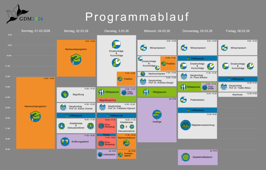 Die GDM schaut auf eine lange Tradition zurück und da dürfen bestimmte Programmpunkte natürlich nicht fehlen. Die Jahrestagung hält neben dem wissenschaftlichen Programm auch Möglichkeiten bereit, den Tagungsort genauer kennenlernen zu können sowie mit Kolleg*innen in einen informellen Austausch zu treten. Hier finden Sie einen vorläufigen Programmablauf. Bitte beachten Sie, dass eine finale Planung erst erst nach dem Ende der Beitragseinreichung im Januar erolgen kann.